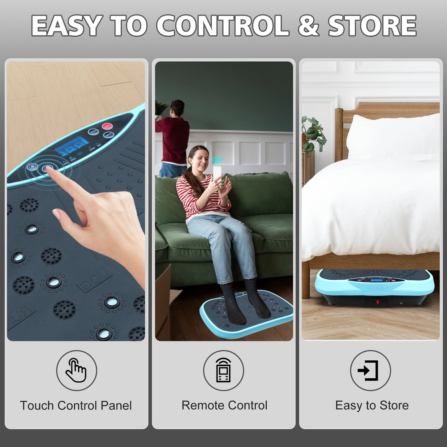 - 【DUAL CONTROL DESIGN】 Our vibration plate can be operated with either the remote control or the on-screen buttons. The LED display shows time and speed so you can see your workout at a glance.
