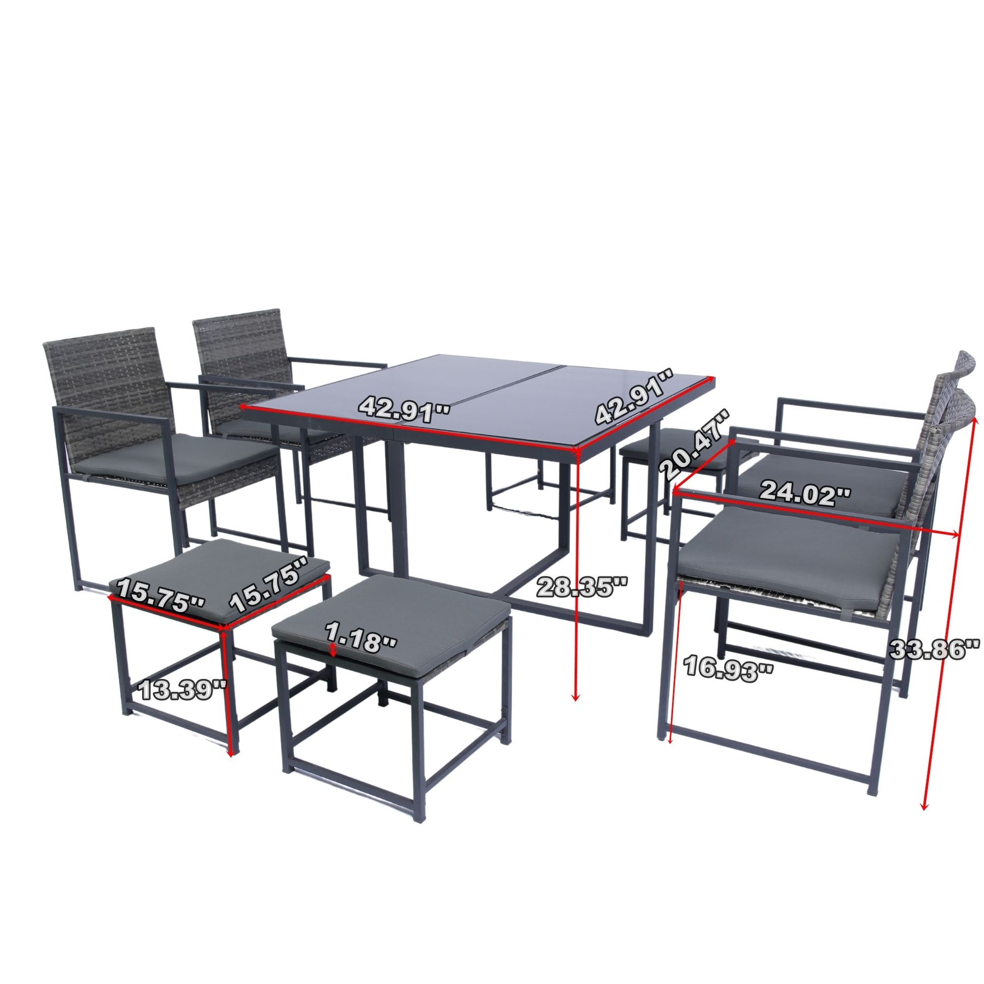 9 Pieces Patio Dining Sets Outdoor Space Saving Rattan Chairs With Glass Table Top Wicker And Cushion - Dark Gray