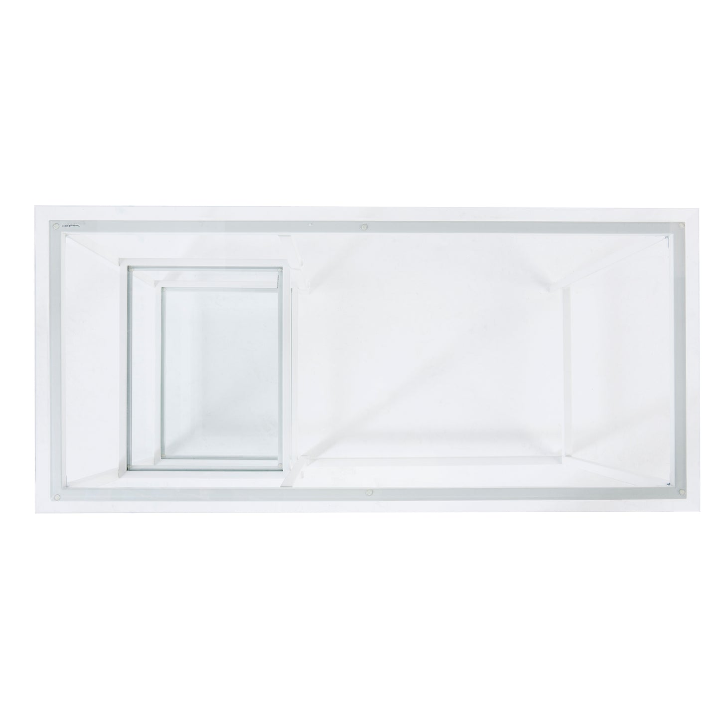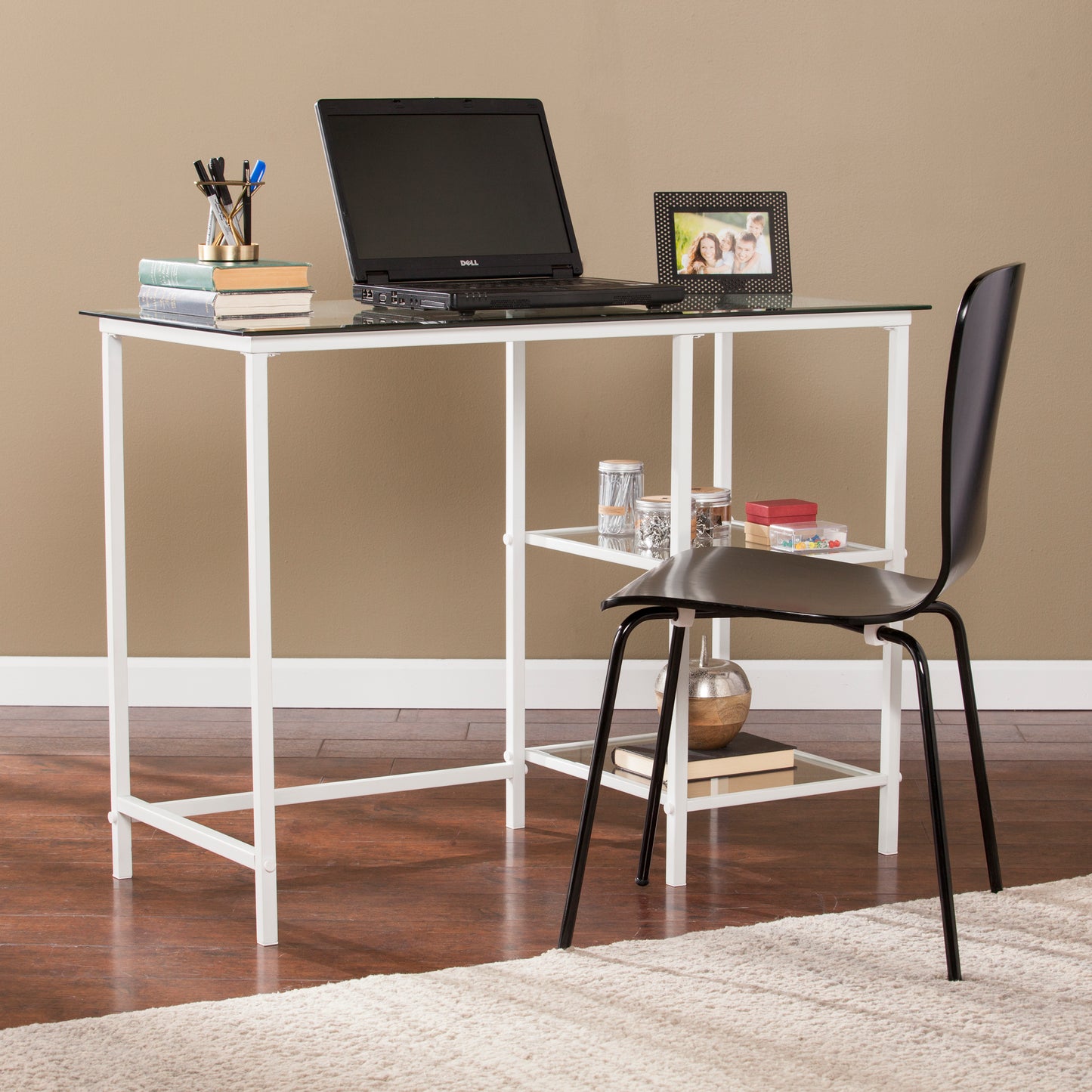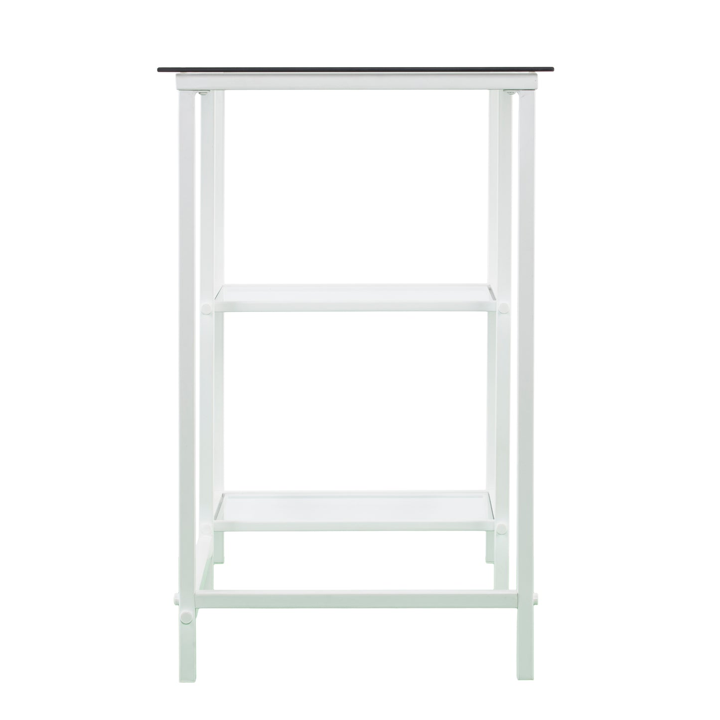 - Sturdy white metal frame combines with shatter-resistant tempered glass for ample work and shelving space