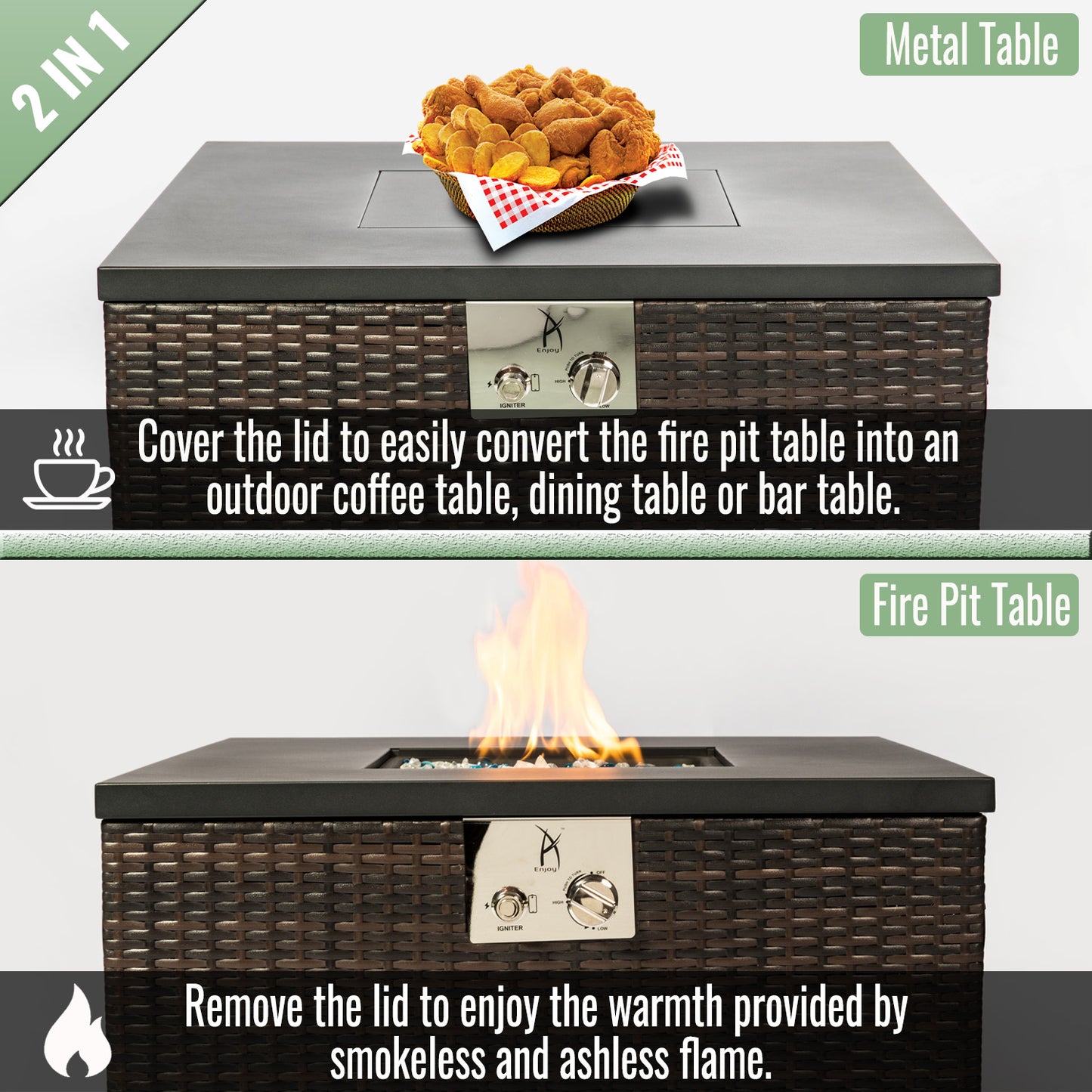 - All-Weather Durability for Year-Round Use: Built to endure harsh conditions, the fire pit features a powder-coated steel frame and weatherproof wicker exterior. The heat-resistant iron tabletop resists wear, while the wicker stands strong against rain, UV rays, and temperature swings. Its sturdy yet compact construction guarantees lasting style and reliability season after season.