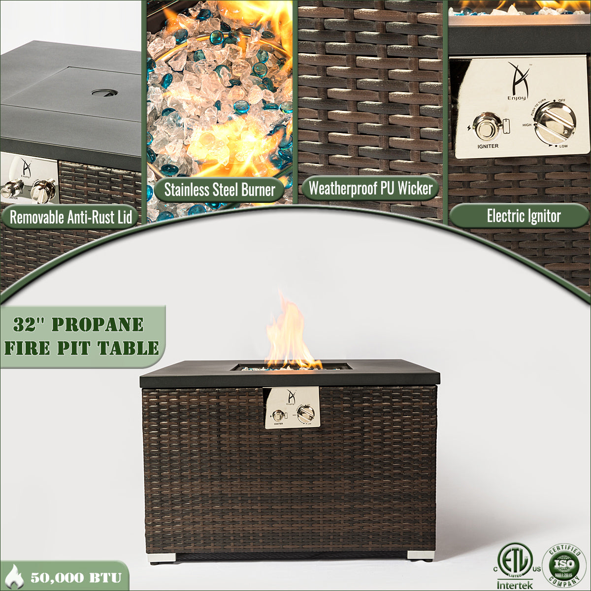 - Powerful 50,000 BTU Output for Inviting Warmth:Experience unmatched warmth with a robust 50,000 BTU fire pit, perfect for creating a cozy outdoor ambiance on cool evenings. The striking black iron tabletop pairs seamlessly with a handwoven wicker base, merging industrial durability with rustic charm. The stainless steel burner features advanced pulse ignition for effortless startup and precise flame adjustment, ensuring both functionality and sleek design.