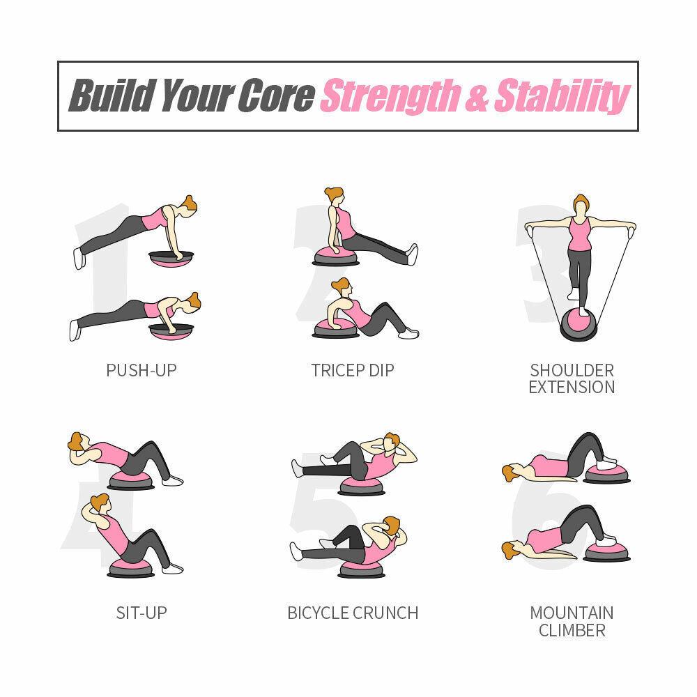 - By placing this half ball dome down, you can work on your balance and your core stabiliser muscle; If you place it dome side up, you can stand, sit, or lie on it and work on your core; Comes with two high-density resistance bands with the comfy grip handles to reduce vibration and hand blister, allowing you to experience low impact workouts that are designed to target your core muscles and build your strength
