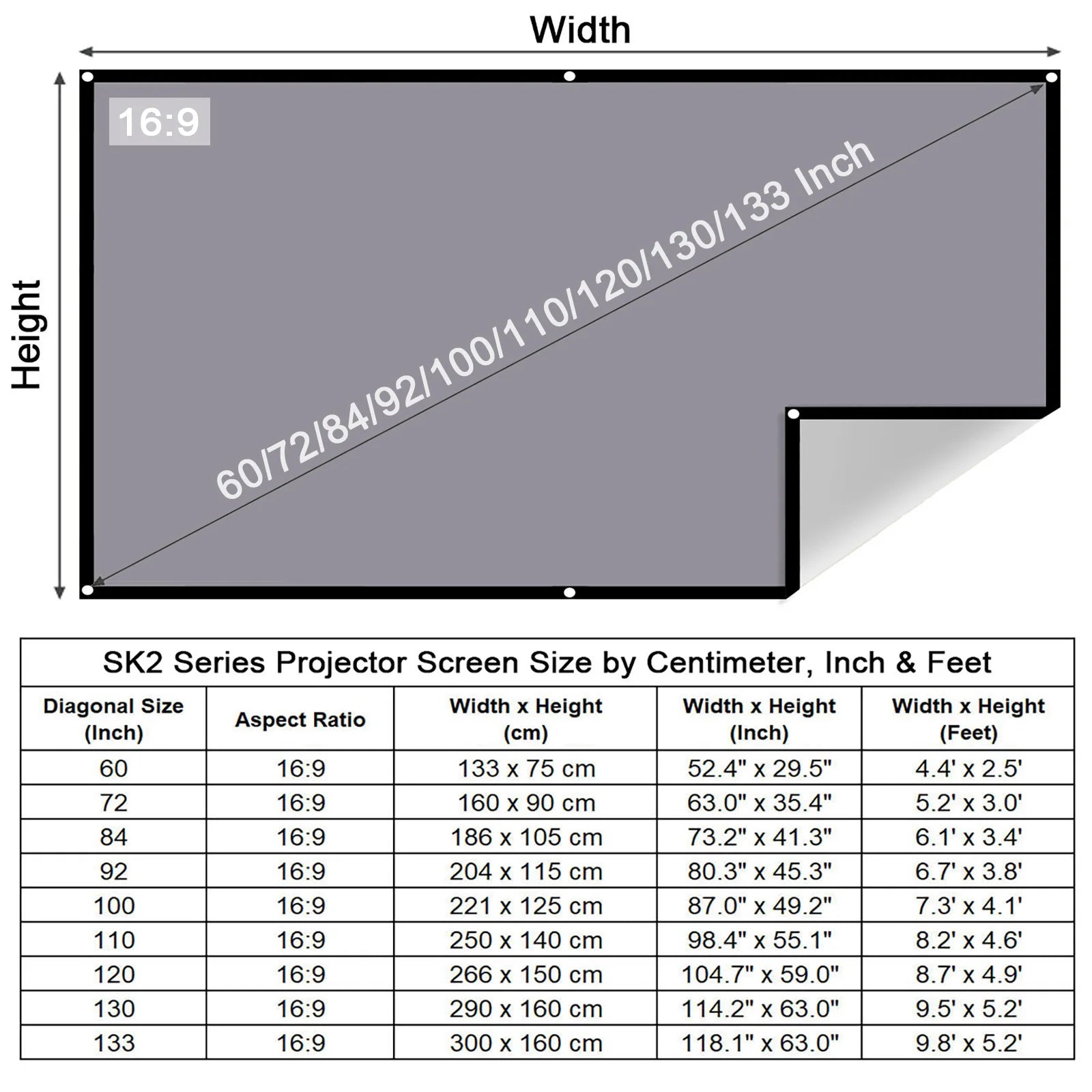 Please check your size before making the order, we offer 60/72/84/92/100/110/120/130/133 inches for choose, the size is diagonal size, you can check their width and height from the following form.