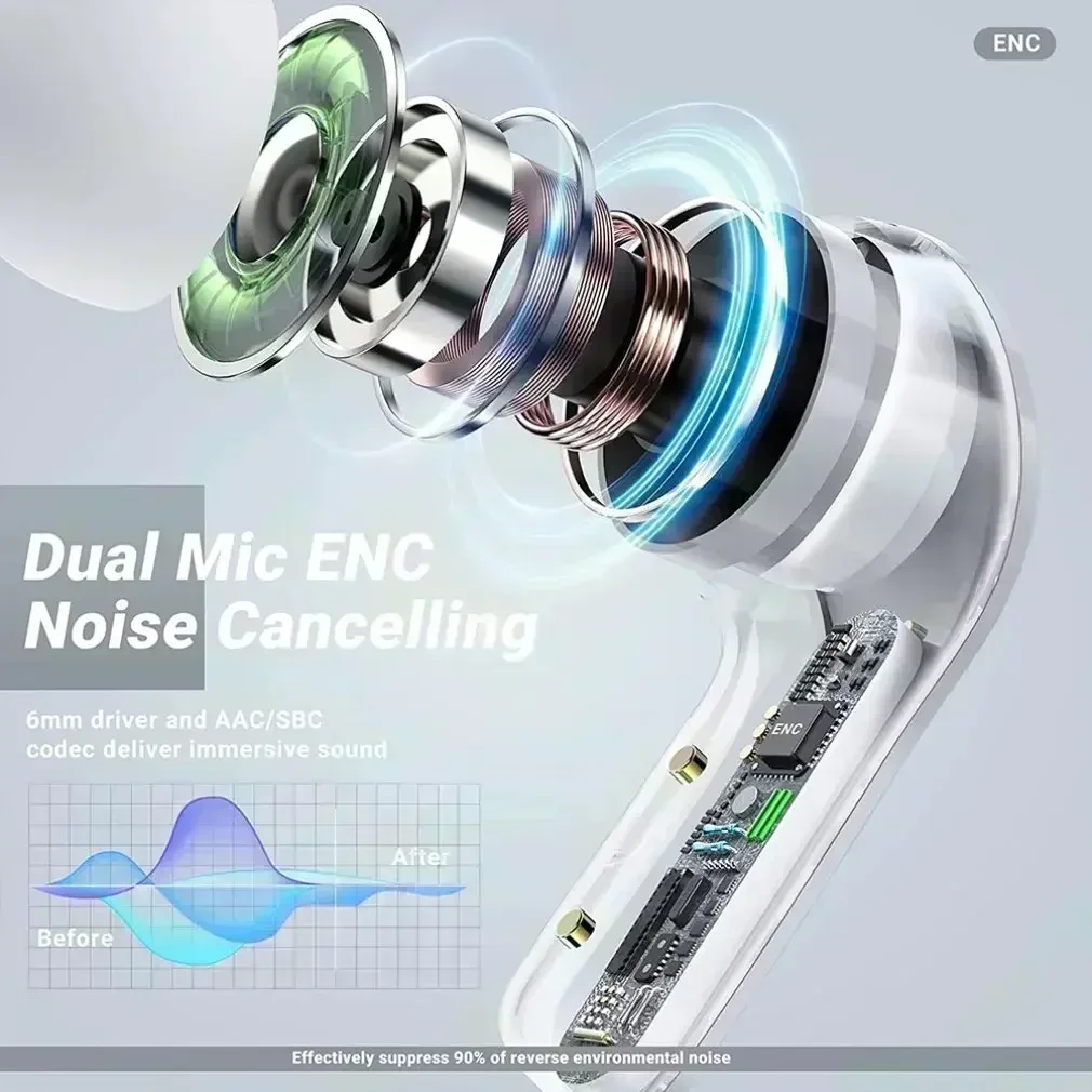 [Advanced Bluetooth Chip & Auto Quick Pairing] The noise canceling wireless earbuds adopts high computing power Bluetooth chip solution, which has stable signal and clear sound quality without attenuation. T6 wireless earphones can achieve simple and high-speed automatic connection. Adopting hall switch,after the first connection, it will connect with your device as soon as the charging case opens.