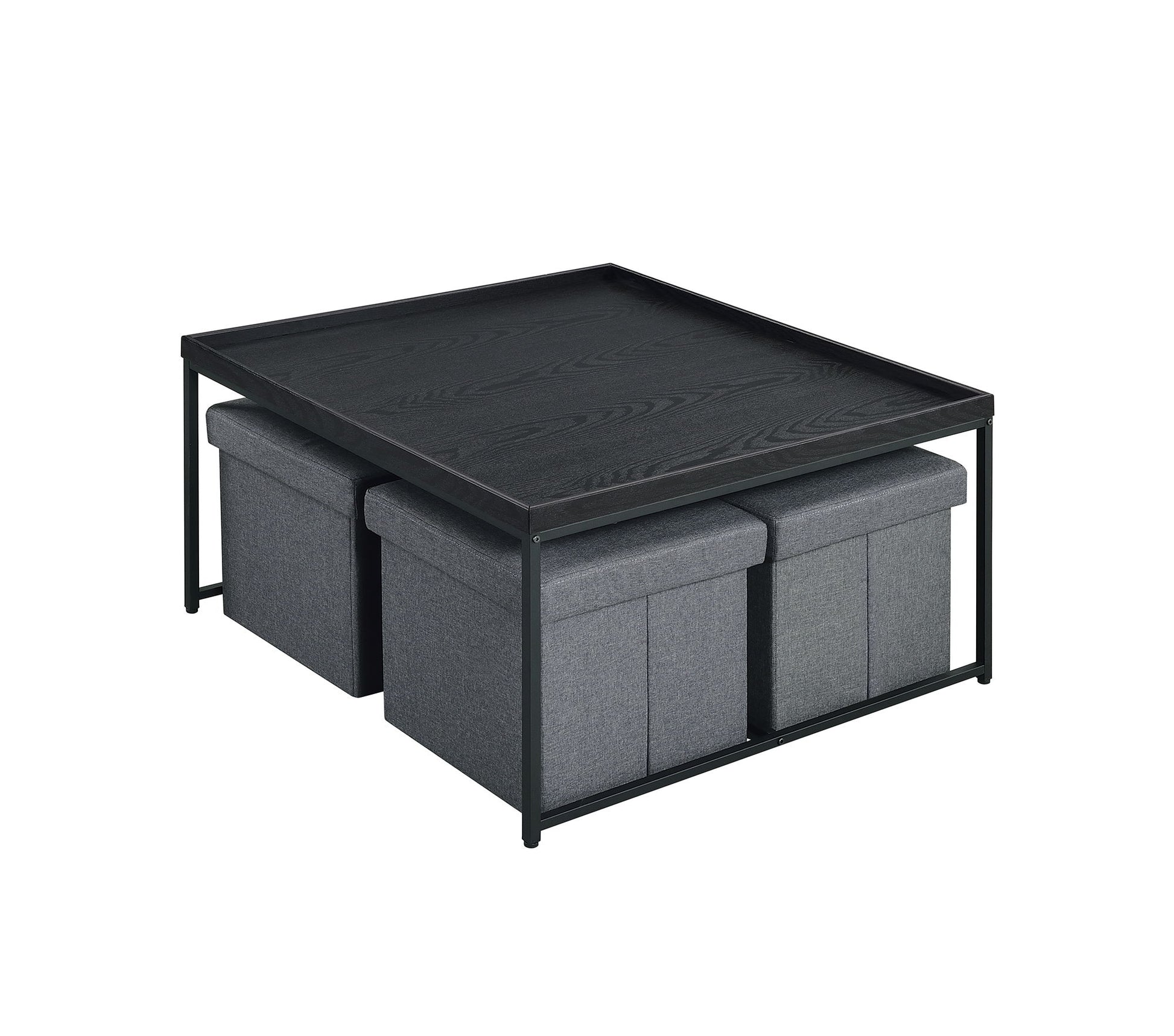 - Looking to style your living room all the while keeping it tidy? The Vinny collection is just the set for you! The Vinny collection manages to be stylish and compact. Featuring a stunning wooden tabletop with raised edges and black metal frame, this coffee table is sure to become the envy of your peers. The raised edges are perfect for keeping items on the table and making your possessions slide or rolling off a thing of the past. Keeping your living space clear of clutter has never been easier with the included storage stools. Invite your friends and family for a cup of coffee and enjoy chatting or use this table as the perfect board game table. The possibilities are endless when you go with the Vinny Collection.